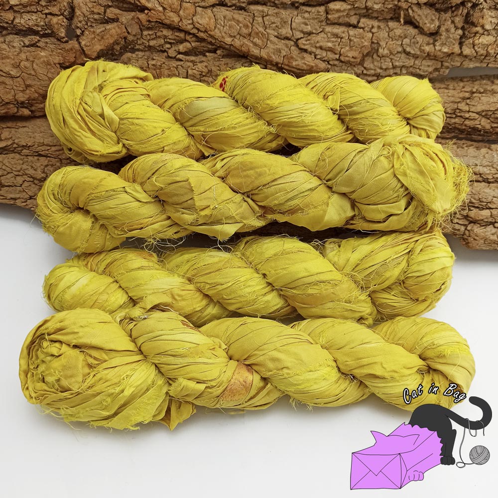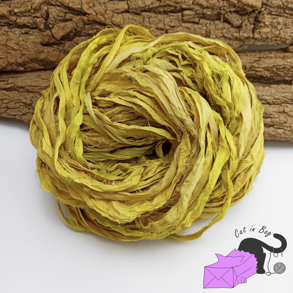 Data la particolare lavorazione fatta a mano e il fatto che i tessuti siano di riciclo, non è possibile garantire la larghezza (che può variare da circa 0,5 cm ad anche 3 o 4 cm) o la tipologia di tessuto che può variare da matassa a matassa, si tratta sempre di tessuto in seta indiana, ma trama e grossezza del tessuto possono variare dalle foto.